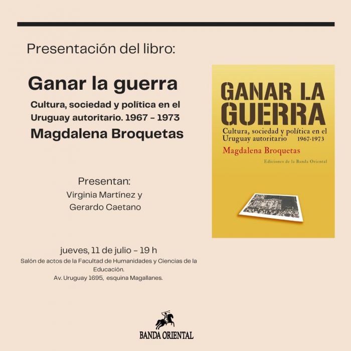 El jueves 11 de julio, a las 19.00 horas, en el Salón de actos de la FHCE se llevará a cabo la presentación del libro “Ganar la guerra. Cultura, sociedad y política en el Uruguay autoritario. 1967 – 1973” de Magdalena Broquetas.