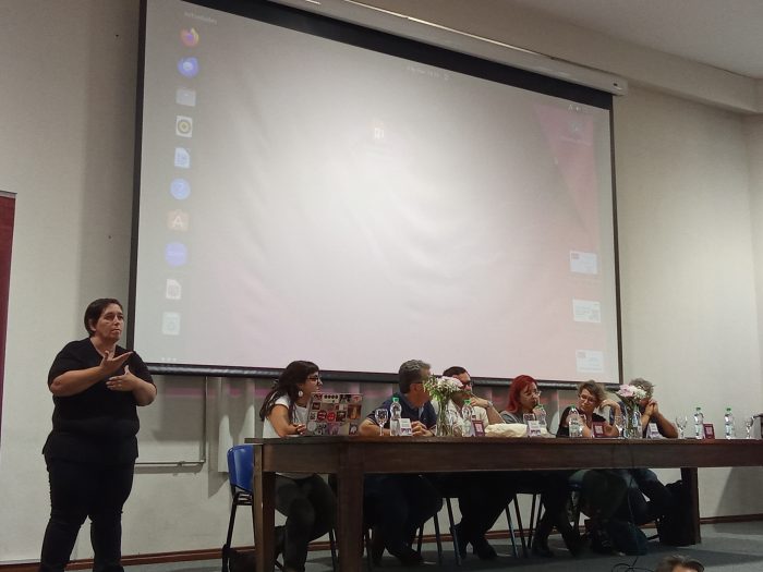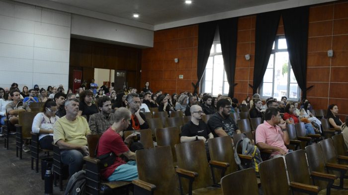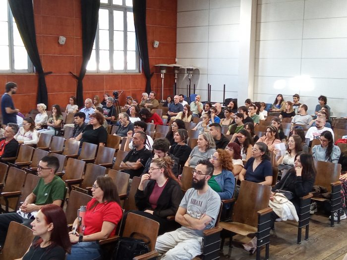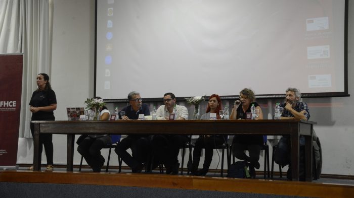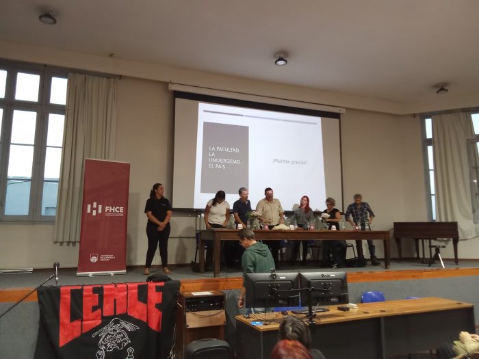 La actividad, dirigida a toda la comunidad de la FHCE (estudiantes, docentes, funcionarias/os y egresadas/os), inició con una mesa de oradores integrada por el decano Nicolás Duffau, un representante por cada orden (estudiantes, egresados y docentes) y una representante de la Agremiación Federal de Funcionarios de la Universidad de la República (AFFUR).