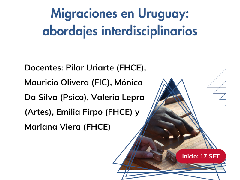 A partir del 17 de setiembre el equipo docente conformado por Pilar Uriarte (FHCE), Mauricio Olivera (FIC), Mónica Da Silva (Psico), Valeria Lepra (Artes), Emilia Firpo (FHCE) y Mariana Viera (FHCE), estarán dictando el curso: “Migraciones en Uruguay: abordajes interdisciplinarios”.